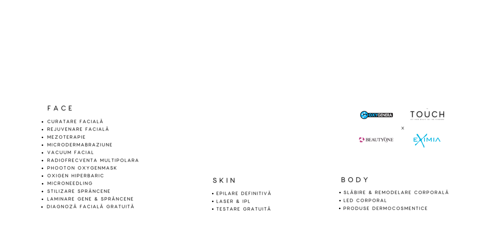 Tratamentele faciale profesionale sunt personalizate pentru a îmbunătăți sănătatea și aspectul tenului, prin curățare, hidratare, regenerare și stimulare a colagenului. Pielea devine catifelată, luminoasă și revitalizată, iar rezultatele sunt vizibile și de durată.